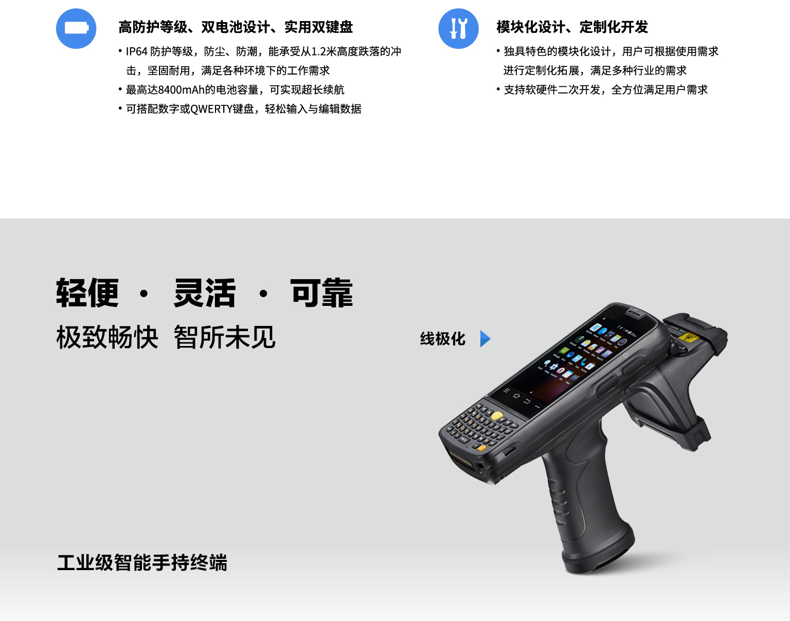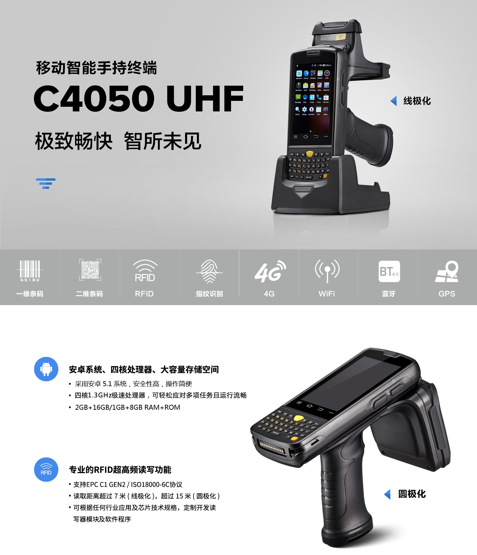 深圳成為C4050 UHF RFID 手持終端是一款超高頻工業(yè)級智能手持終端。基于Android 5.1操作系統(tǒng),搭載高性能四核處理器,配備可拆卸電池且支持電池手柄,運(yùn)行快速且續(xù)航持久。集成性能優(yōu)異的UHF RFID功能,標(biāo)簽識讀精準(zhǔn)快速,室外空曠環(huán)境讀距超過15米,且支持標(biāo)簽群讀,同時可選配高性能條碼功能,現(xiàn)廣泛應(yīng)用于零售連鎖、物流快遞、服裝管理、倉儲管理、能源化工等領(lǐng)域。