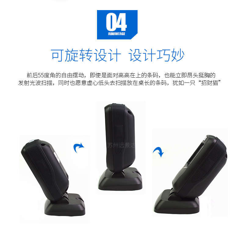 7、靈活的角度可旋轉(zhuǎn)設(shè)計(jì):前后55°的自由擺動(dòng),即使是面對(duì)高高在上的條碼,也能立即昂頭挺胸地發(fā)射光波掃描,同事也愿意虛心低頭去掃描放在桌上的條碼,猶如一只“招財(cái)貓”;