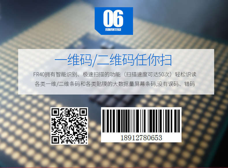 4、卓越的條碼識(shí)讀性能:采用自主研發(fā)的第五代核心解碼技術(shù),可以快速識(shí)讀各種一維、二維條碼和各類貼膜的大數(shù)據(jù)量屏幕二維條碼;